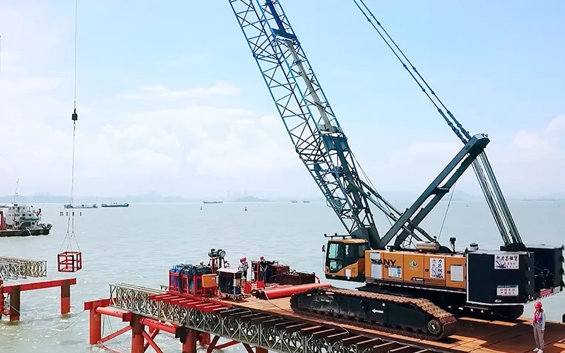 2019年7月,多台三一履带式起重机正在下放伶仃洋大桥——深中通道关键组成部分——的首个钢吊箱。吊箱高14.5米,外径41.2米,重约1800吨,超过7架空客A380飞机的总重量。吊箱是重要的防撞措施,为桥梁提供有力的安全保障。经过10个小时的连续作业,三一起重机将箱体准确下放到位。
