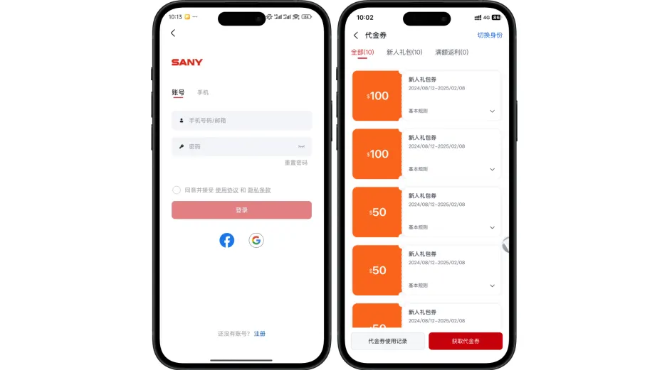 5. 代金券仅支持从MySANY端发起的配件订单使用,已用券订单不再返券;