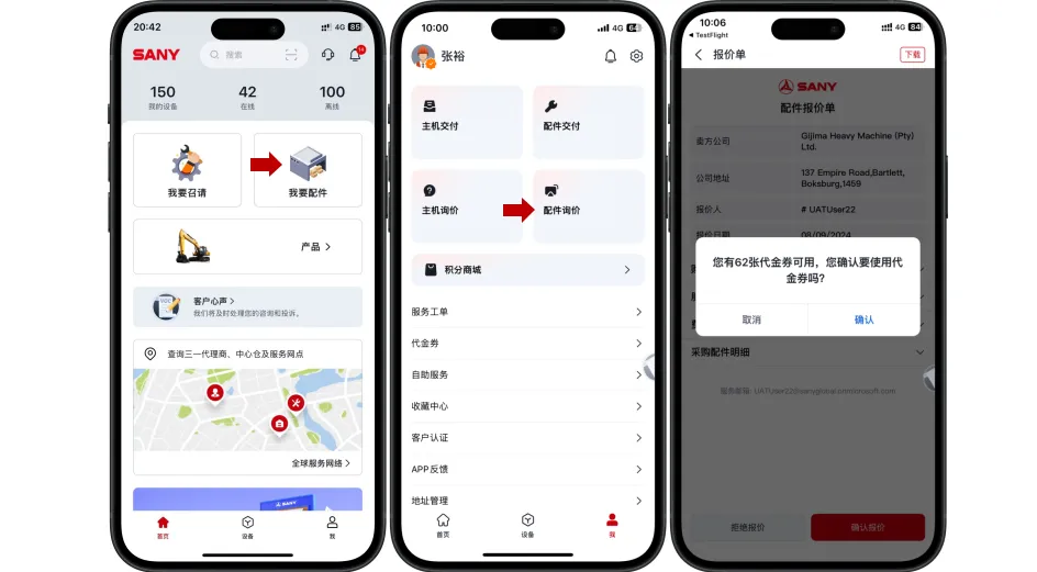 您使用MySANY APP发起配件询价-确认报价-提交订单-全部解款后,即可领取;
