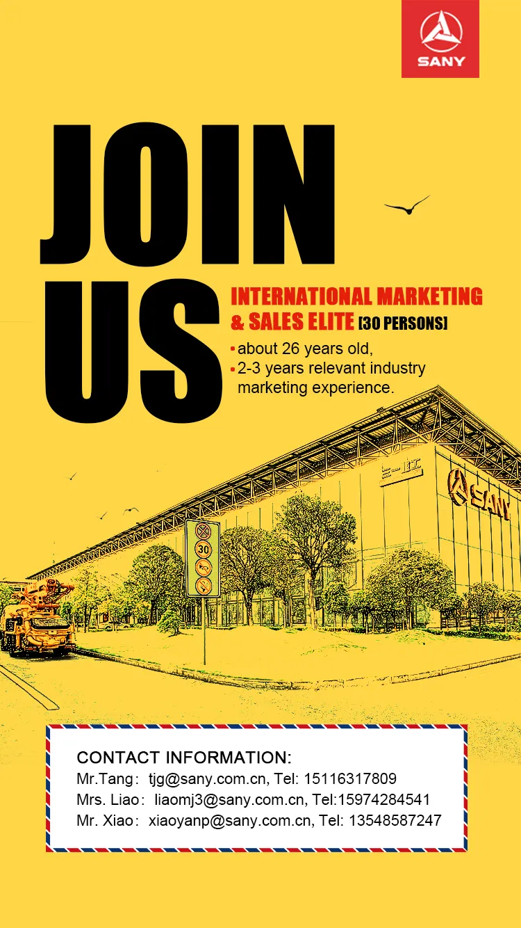 For international business expansion in the long run, SANY Group is opening this training program for international Marketing & Sales Elite candidates. It is planned to recruit 30 persons from the marketing field of construction machinery and related industries. The goal is to cultivate the candidates to be the key business development employee and enterprise operations partners in overseas business units and countries after series of intensive training, internship, rotations and evaluation within one year.