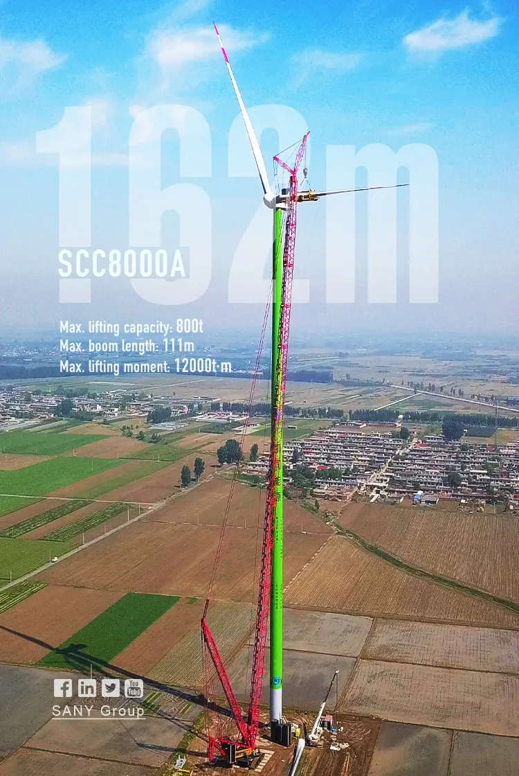 In Luanhekou wind farm, a nacelle of wind turbine whose power reaches 3.8MW is carefully raised to match the 162-meter-high tower with the help of SCC8000A, the sought-after crawler crane of SANY. According to the plan for the second development phase of Luanhekou wind farm, forty-two new wind turbines with that height will be erected while the number of its counterparts in Europe is only seven. The new world No.1 is on the making.