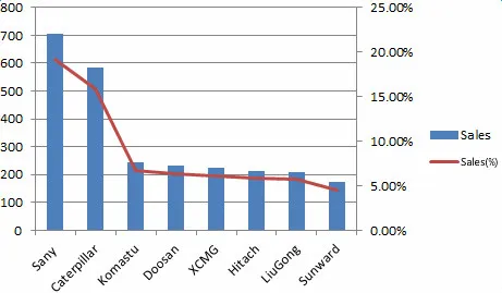 Sany’s small excavators dominated the market, with Sany’s sales volume alone reaching 351, to make up 20.8% of total sales. Its medium and large excavator sales were the second and third-ranking in their respective categories.