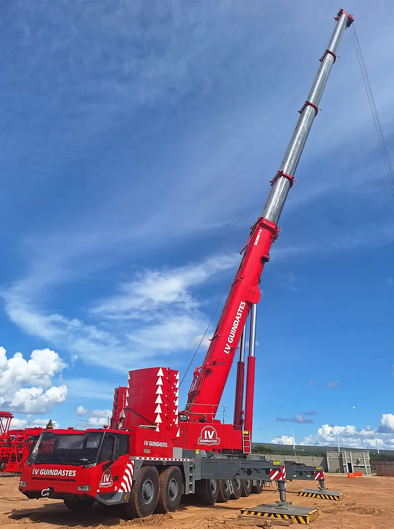 Um dos modelos em destaque é o guindaste sobre caminhão SANY SAC8000T7-8, uma máquina robusta com 7 eixos e um sistema de motor duplo. Sua lança, composta por 7 seções e atingindo impressionantes 91 metros, oferece versatilidade para uma variedade de tarefas. Além disso, possui uma lança fixa de 66 metros com ajuste hidráulico e uma lança projetada especificamente para energia eólica de 58 metros. O guindaste também inclui um superelevador de treliça, um contrapeso de 183 toneladas e uma cabine de última geração, proporcionando eficiência e segurança nas operações. O diretor da I.V. Cranes, empresa que adquiriu a máquina, enfatiza: "O equipamento fortalecerá nossa frota dedicada à manutenção de parques eólicos, garantindo e ampliando a variedade de turbinas eólicas que podemos atender, alcançando todos os modelos disponíveis." - Igor Boff, Diretor.